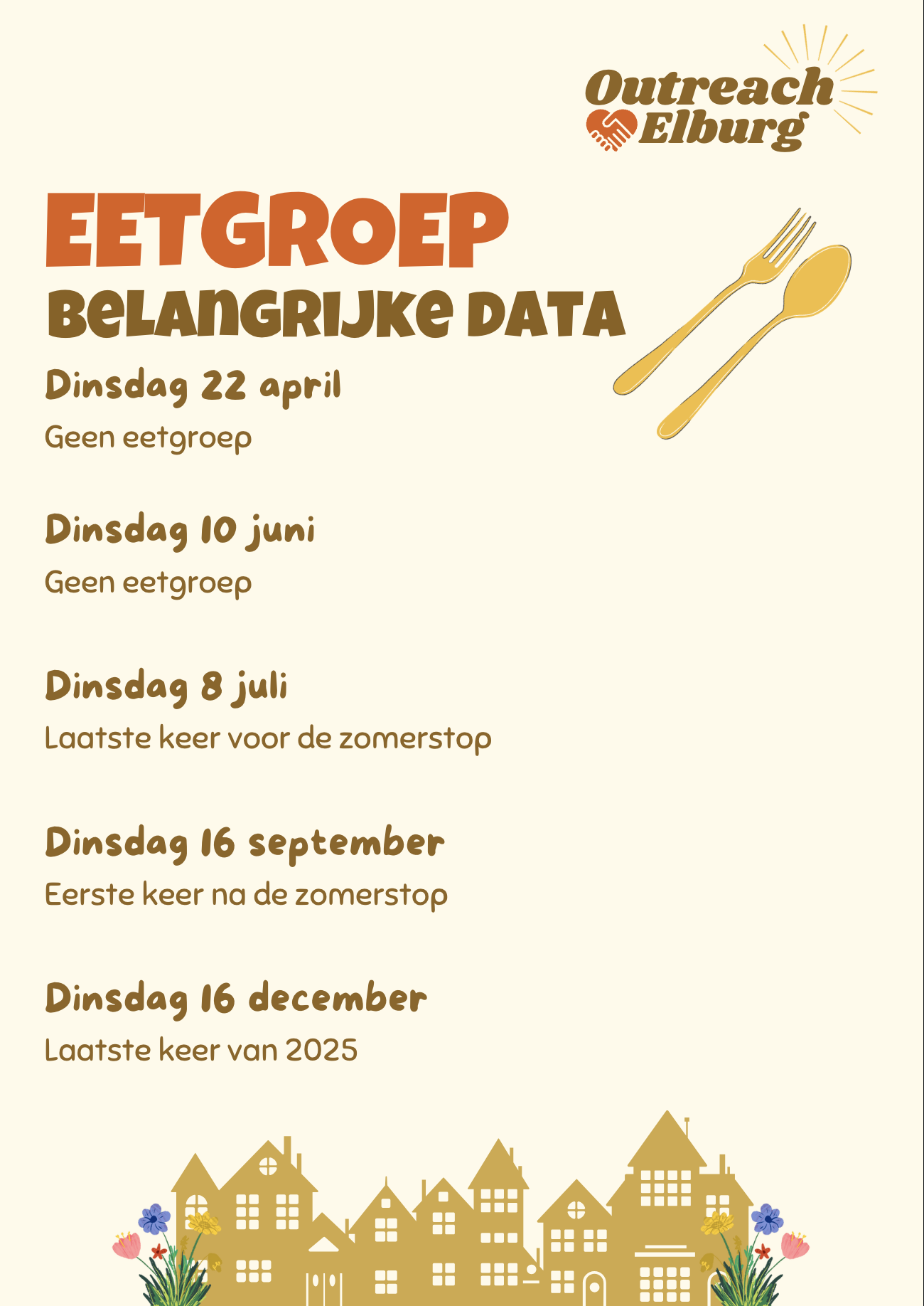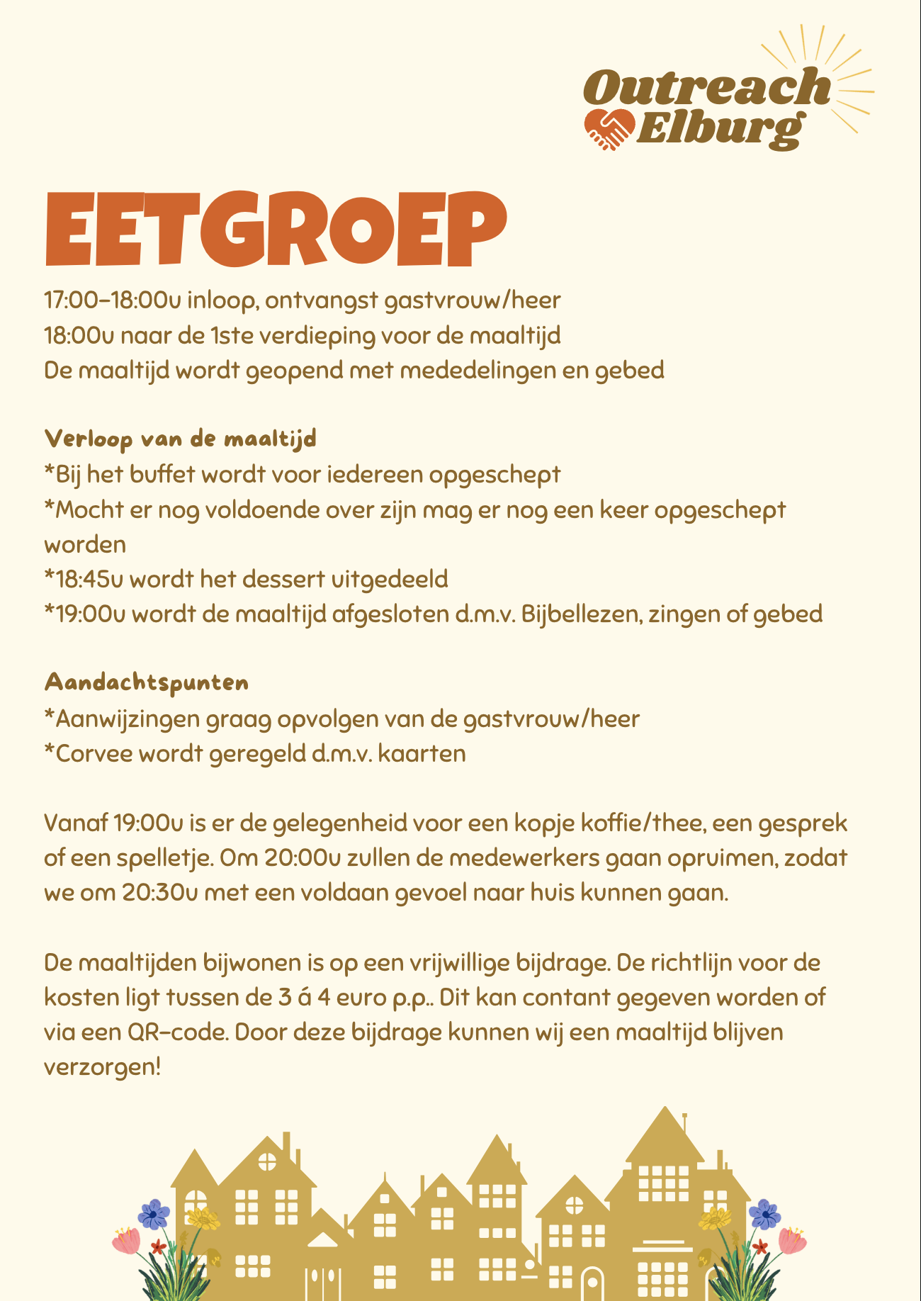 Elke dinsdag is er een eetgroep waar je voor een vrijwillige bijdrage gezellig mag komen mee-eten. De eetgroep is een geweldig moment om elkaar te leren kennen en te delen in de maaltijd.